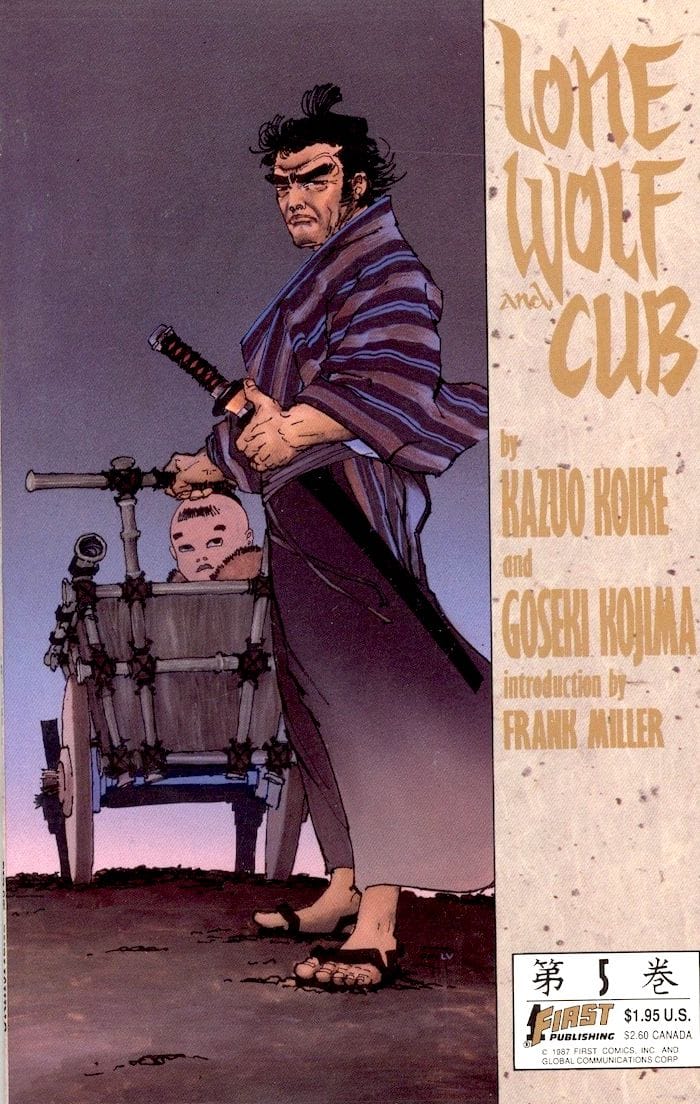 This leads to my actual introduction to manga. I learned in 1987 that Miller was involved in a project titled Lone Wolf and Cub. He was bringing this traditional Japanese story line to an American comic audience. The internal content was by the original creators – Kazuo Koike and Goseki Kojima. The cover art and written introductions were by Frank Miller. The books leaned heavy into the moody illustrations, and were intentionally light on written dialogue and narration.