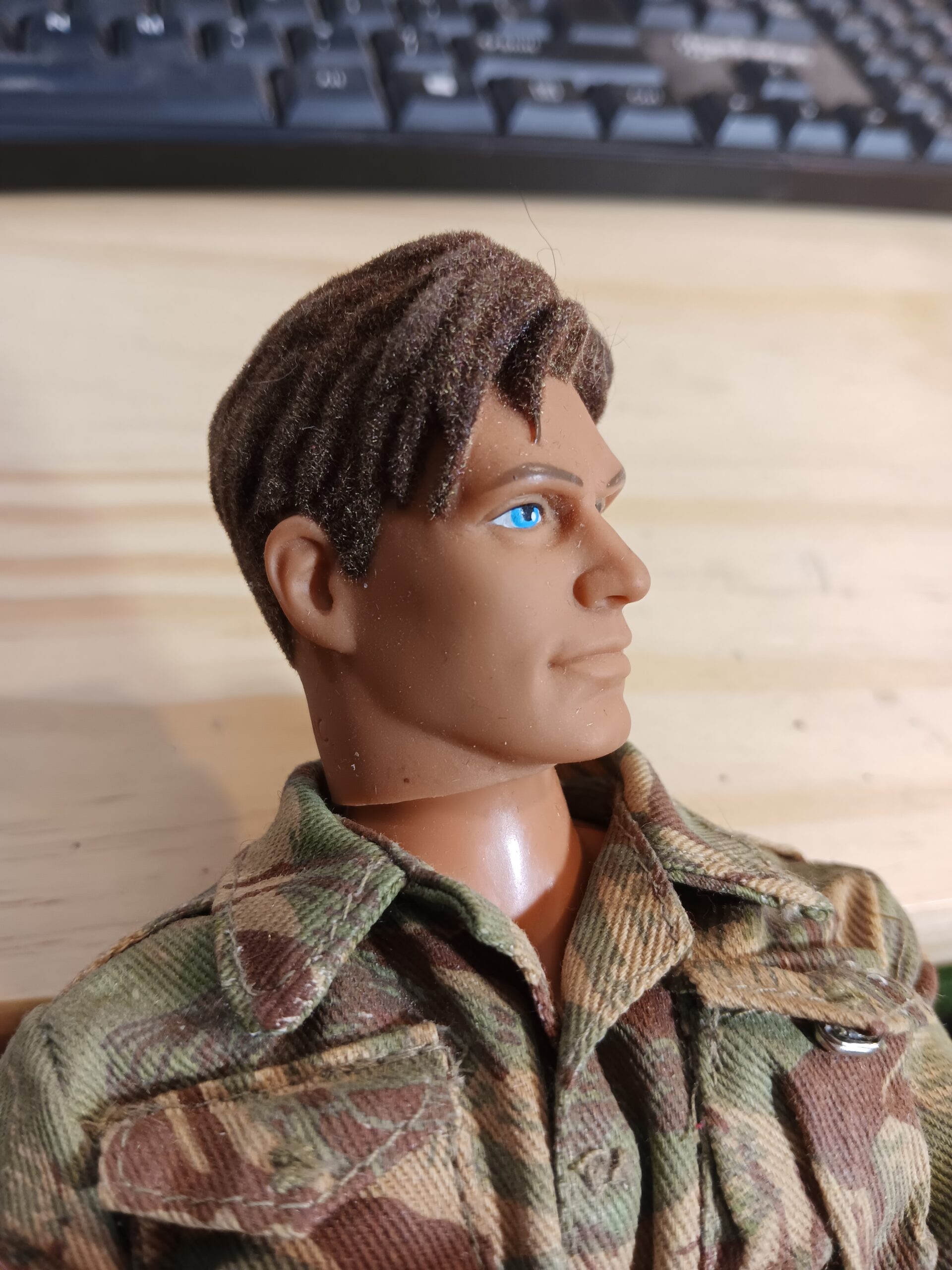 The selection of new 1/6th figures on store shelves has been pretty lean, and I don’t foresee the dry spell getting better in the very near future. Also, my room has reached maximum capacity. (Truth be told, it has long surpassed maximum capacity.)  As a result, I’ve been focusing on working with what I already have. I’m getting back into personalizing a few guys; flocking and detailing some of my 1/6th scale heads. I tend to use the military figures plain, but the “Adventure” themed ones get flocked – just my little way of organizing my collection. I figure, if that’s how Hasbro differentiated active duty soldiers from paramilitary adventurers, why reinvent the wheel? Plus, it lets me mix and match duplicate headsculpts into a variety of unique looks. And why limit myself to 4 hair colors?