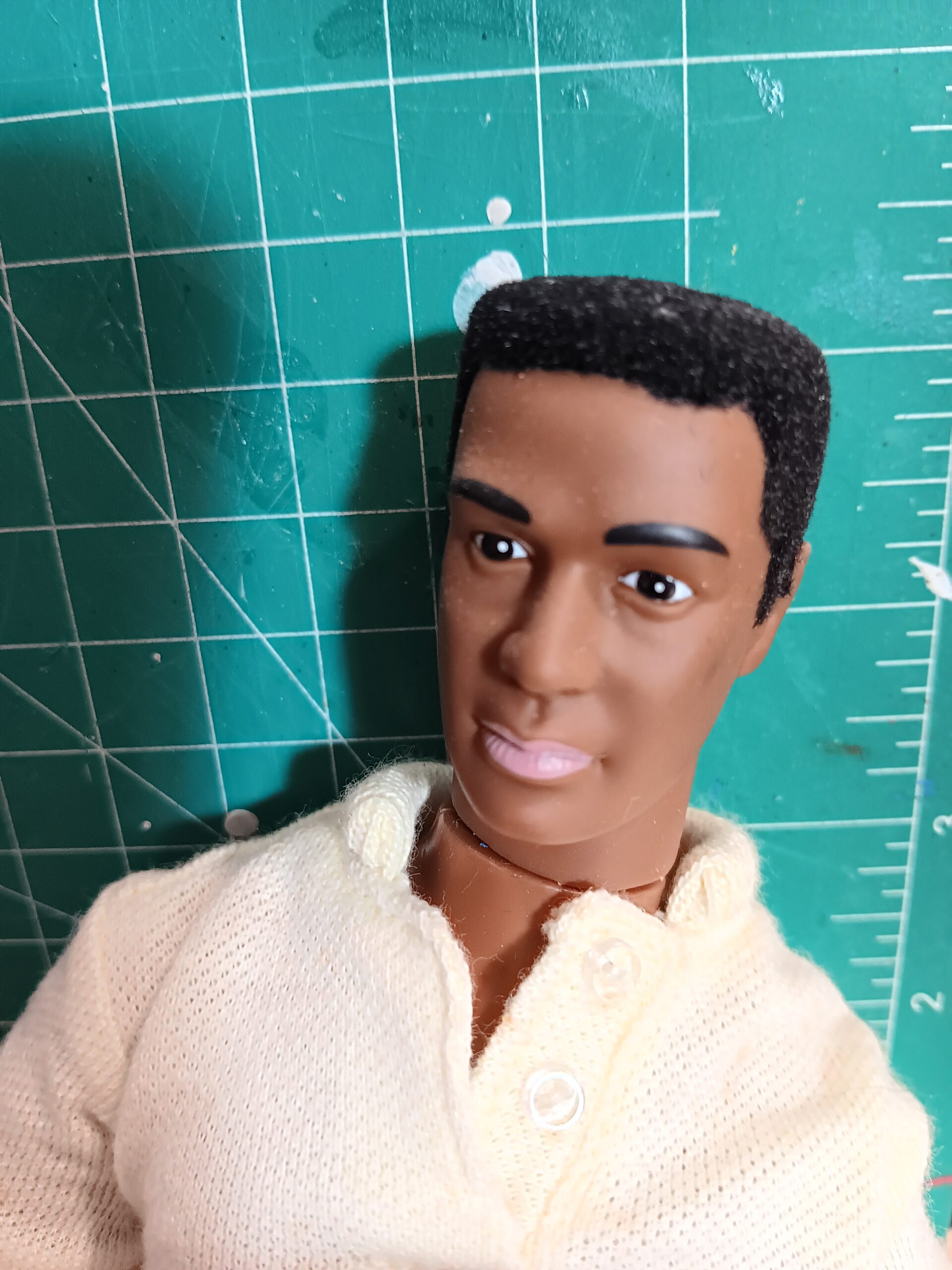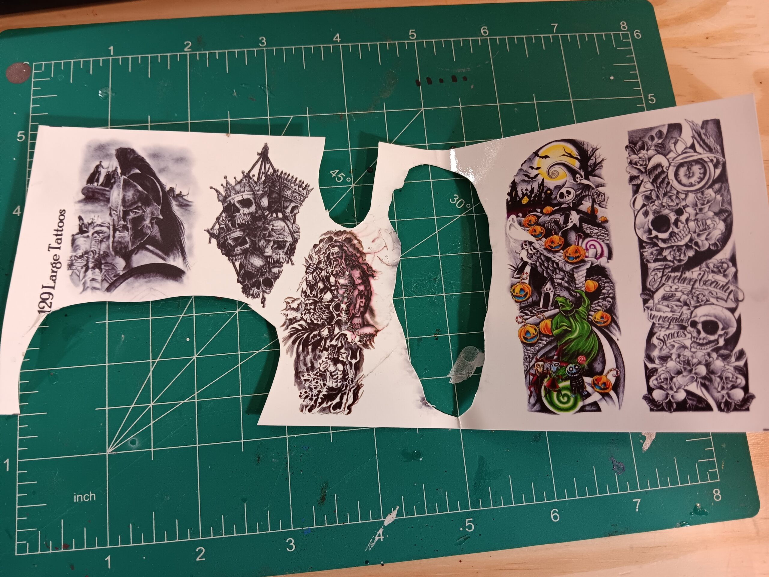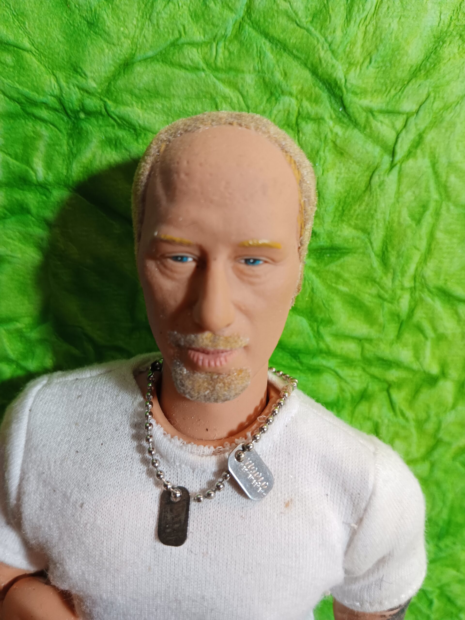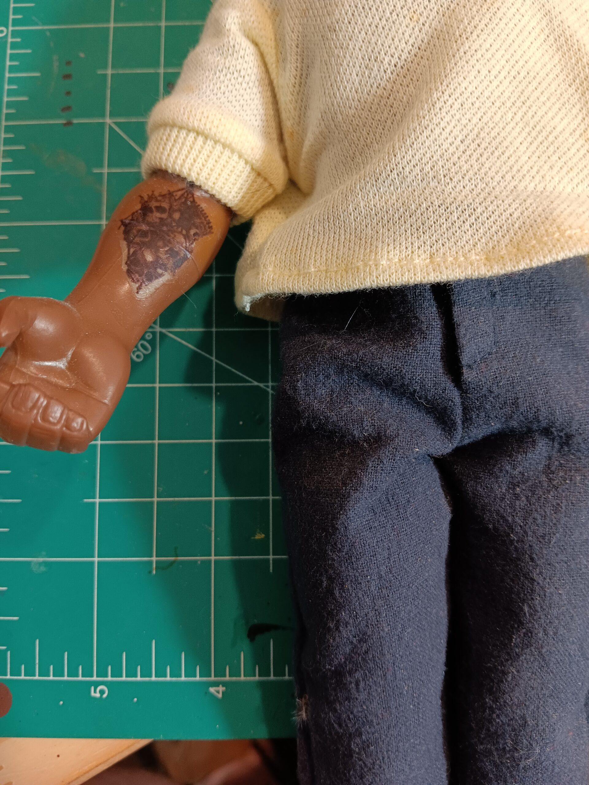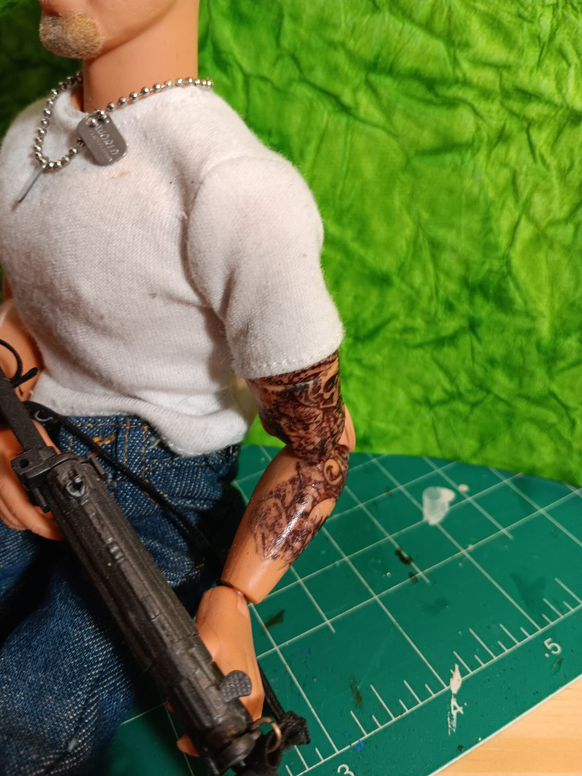 Another way I like to “make it my own” is to occasionally add or remove a scar or tattoo. There are several waterslide decals available on Ebay, made by different companies. Tattoos have themes, like Marine Corps, Russian mafia, tribal symbols, Viking runes, and old style nautical (just to name a few.)  Although the flash on the photo makes it a little more obvious, once it’s applied and coated with a clear matte varnish, they really are pretty convincing in person.
