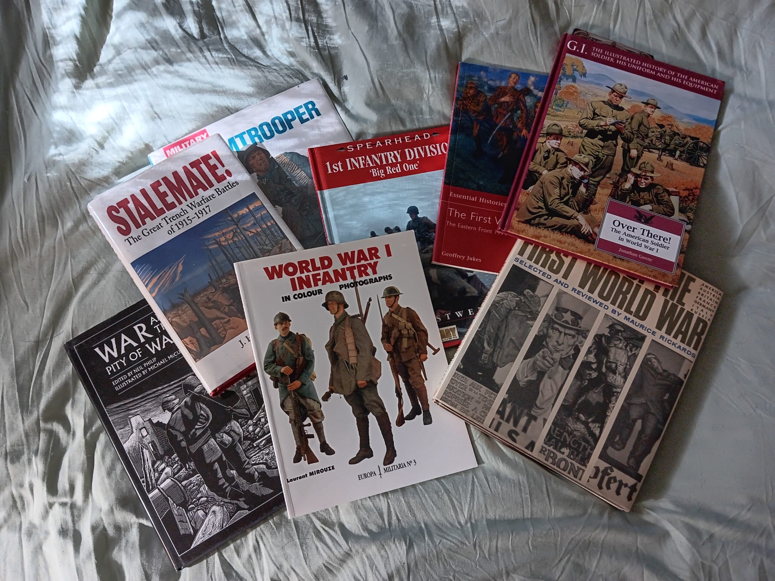 It led me down a rabbit hole that branched into a couple of different directions. I began studying the US involvement (1917-18) in World War One (also known as “The Great War,” “War to End All Wars”, and “WWI”). I read several of the resource books I have collected over the years. My main area of interest has always been the Second World War. As it turns out, I have a surprising amount of previously unexplored material on the prequel.